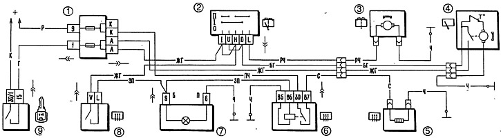 1 - блок предохранителей; 2 - переключатель очистителя и омывателя заднего стекла; 3 - электродвигатель омывателя заднего стекла; 4 - электродвигатель очистителя заднего стекла; 5 - элемент обогрева заднего стекла; 6 - реле включения обогрева заднего стекла; 7 - контрольная лампа обогрева заднего стекла; 8 - выключатель обогрева заднего стекла; 9 - выключатель зажигания.