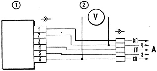 Работоспособность блока управления проверяется с помощью вольтметра (с пределами измерения 0-15 В) в следующем порядке: