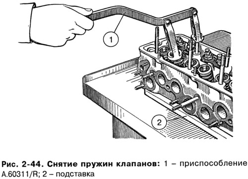 Установите приспособление А.60311/R, как показано на рис. 2-44, сожмите пружины клапанов и освободите сухари. Взамен переносного приспособления А.60311/R можно применять также стационарное приспособление 02.7823.9505.
