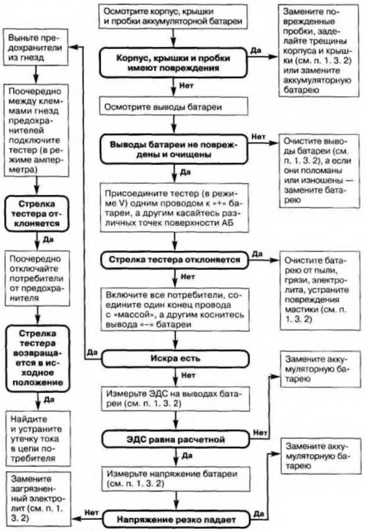Алгоритм поиска неисправностей для этого случая приведен на рис. 1.7. В ходе работы вам может понадобиться ареометр или плотномер для проверки заряженности батареи.