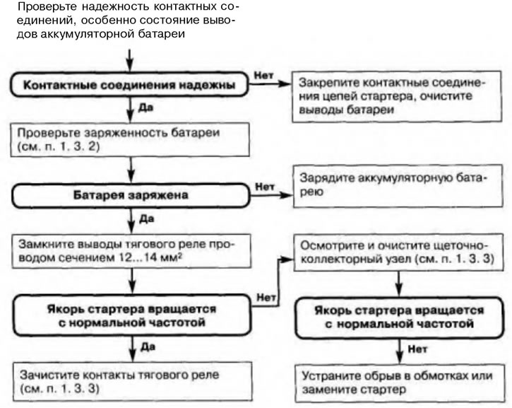 Причинами ненормальной работы стартера в этом случае являются разряженность батареи, нарушение контакта в соединениях, подгорание контактов тягового реле, загрязнение коллектора или изношенность щеток стартера, а также обрыв или замыкание в обмотках стартера. Быстро найти неисправность поможет алгоритм, приведенный на рис. 1.9. Приступая к работе, запаситесь куском толстого провода сечением 12...14 мм², мелкой стеклянной шкуркой и ареометром.