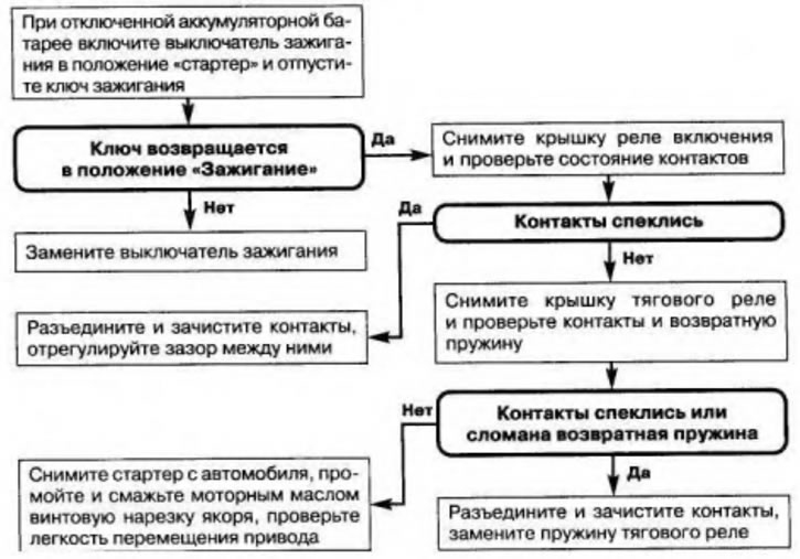 Маховик в этом случае будет вращать муфту свободного хода с высокой частотой, муфта перегреется, и может произойти ее заклинивание. В результате стартер выйдет из строя. Поэтому при невыключении стартера немедленно остановите двигатель. Если же стартер будет продолжать прокручивать коленчатый вал, то разорвите цепь стартера, отсоединив батарею от массы. Невыключение стартера после пуска может быть вызвано спеканием контактов тягового реле или реле включения, неисправностью выключателя зажигания, перекосом стартера или заеданием привода на валу якоря.