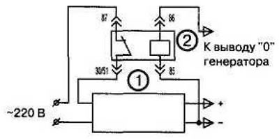 Рис. 7.8. Схема отключения пускозарядного устройства после пуска двигателя: 1 - пускозарядное устройство; 2 - реле PC 702