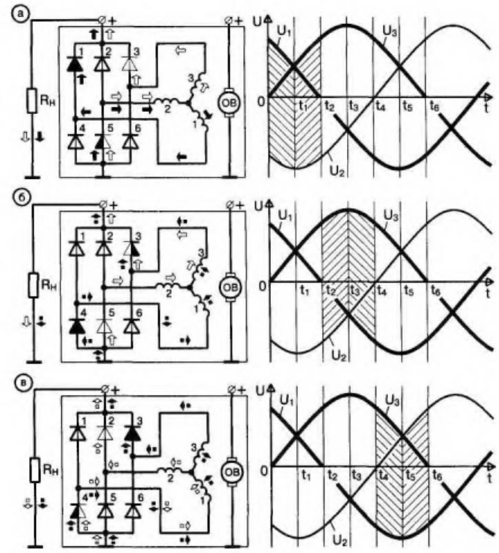 Рис. 2.2. Принцип действия выпрямительного блока генератора