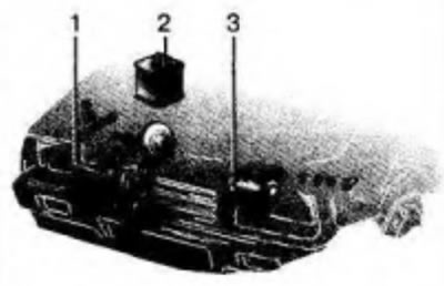 Рис. 2.3. Размещение источников тока и стартера на автомобиле: 1 - генератор; 2 - аккумуляторная батарея; 3 - стартер