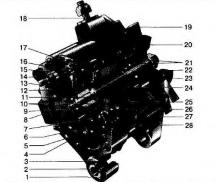 Рис. 2.4. Генератор 37.3701 : 1 - поджимная втулка; 2 - втулка; 3 - буферная втулка; 4 - передняя крышка (со стороны контактных колец); 5 - винт крепления выпрямительного блока; 6 - выпрямительный блок; 7 - вентиль выпрямительного блока; 8 - конденсатор; 9 - задний подшипник вала ротора; 10 - контактные кольца; 11 - вал ротора; 12 - щетка, соединенная с выводом «В» регулятора напряжения; 13 - вывод «30» для подключения потребителей; 14 - вывод «61» генератора; 15 - щетка, соединенная с выводом «Ш» регулятора напряжения; 16 - вывод «В» регулятора напряжения; 17 - регулятор напряжения; 18 - шпилька крепления генератора к натяжной планке; 19 - крыльчатка; 20 - шкив; 21 - пластины крепления подшипника; 22 - упорное кольцо; 23 - передний подшипник вала ротора; 24 - обмотка ротора; 25 - полюсный наконечник ротора; 26 - обмотка статора; 27 - статор; 28 - задняя крышка (со стороны привода)