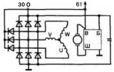 Ротор генератора состоит из обмотки возбуждения 24, намотанной на отдельную втулку. К торцам втулки примыкают два когтеобразных полюсных наконечника 25, образующих двенадцатиполюсную магнитную систему. Концы обмотки возбуждения припаяны к двум контактным кольцам. Втулка, полюсные наконечники и контактные кольца напрессованы на вал 11. В алюминиевой крышке 4 со стороны контактных колец установлены регулятор напряжения 17 с щеткодержателем и выпрямительный блок 6, содержащий шесть диодов — три «положительных» и три «отрицательных». Крышка со стороны привода также изготовлена из алюминия. В обеих крышках имеются вентиляционные окна и лапы для крепления на двигателе. Шкив и вентилятор устанавливаются на вал генератора на шпонке и закрепляются гайкой с пружиной. Электрическая схема генератора приведена на рис 2.5.